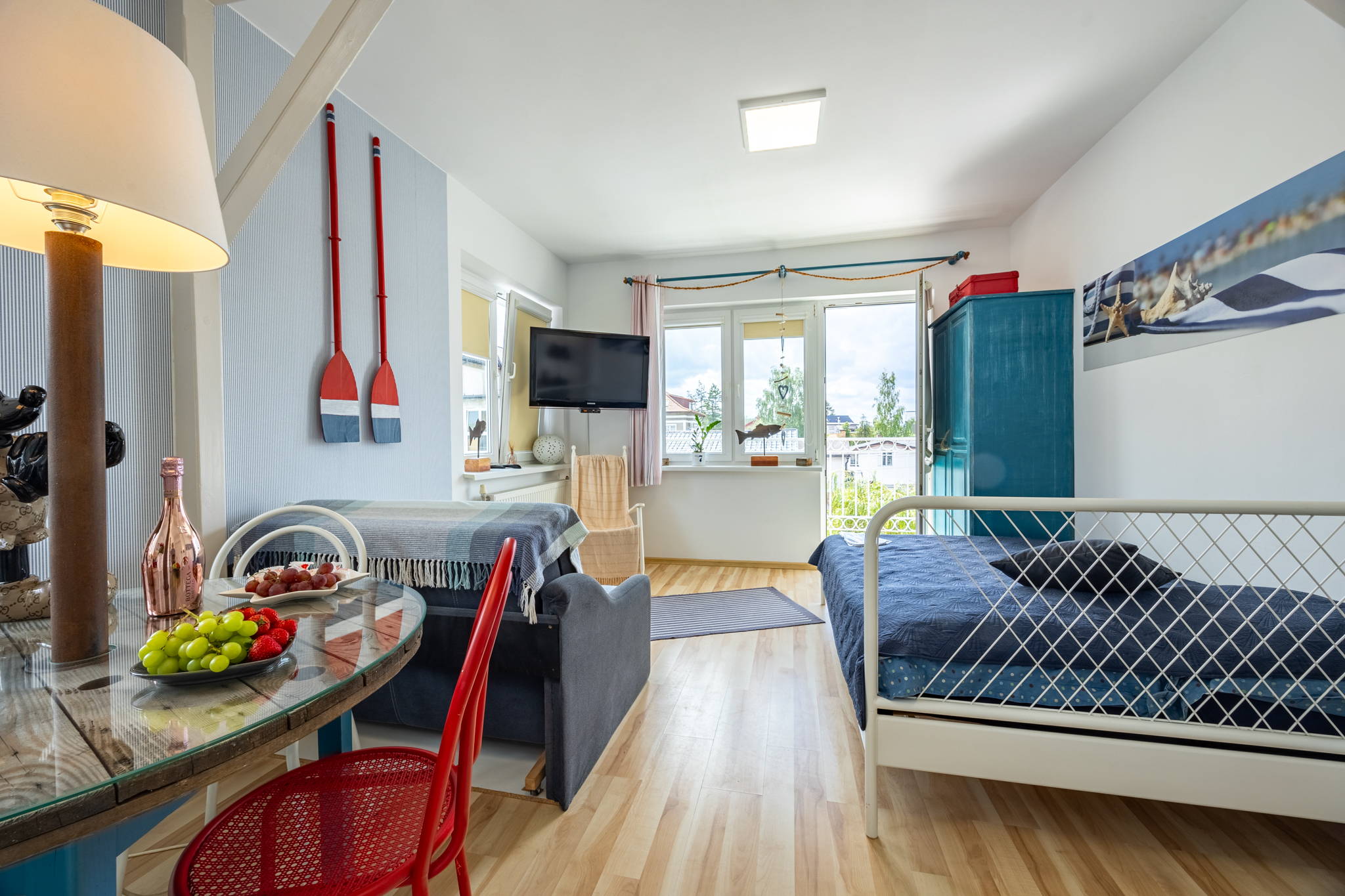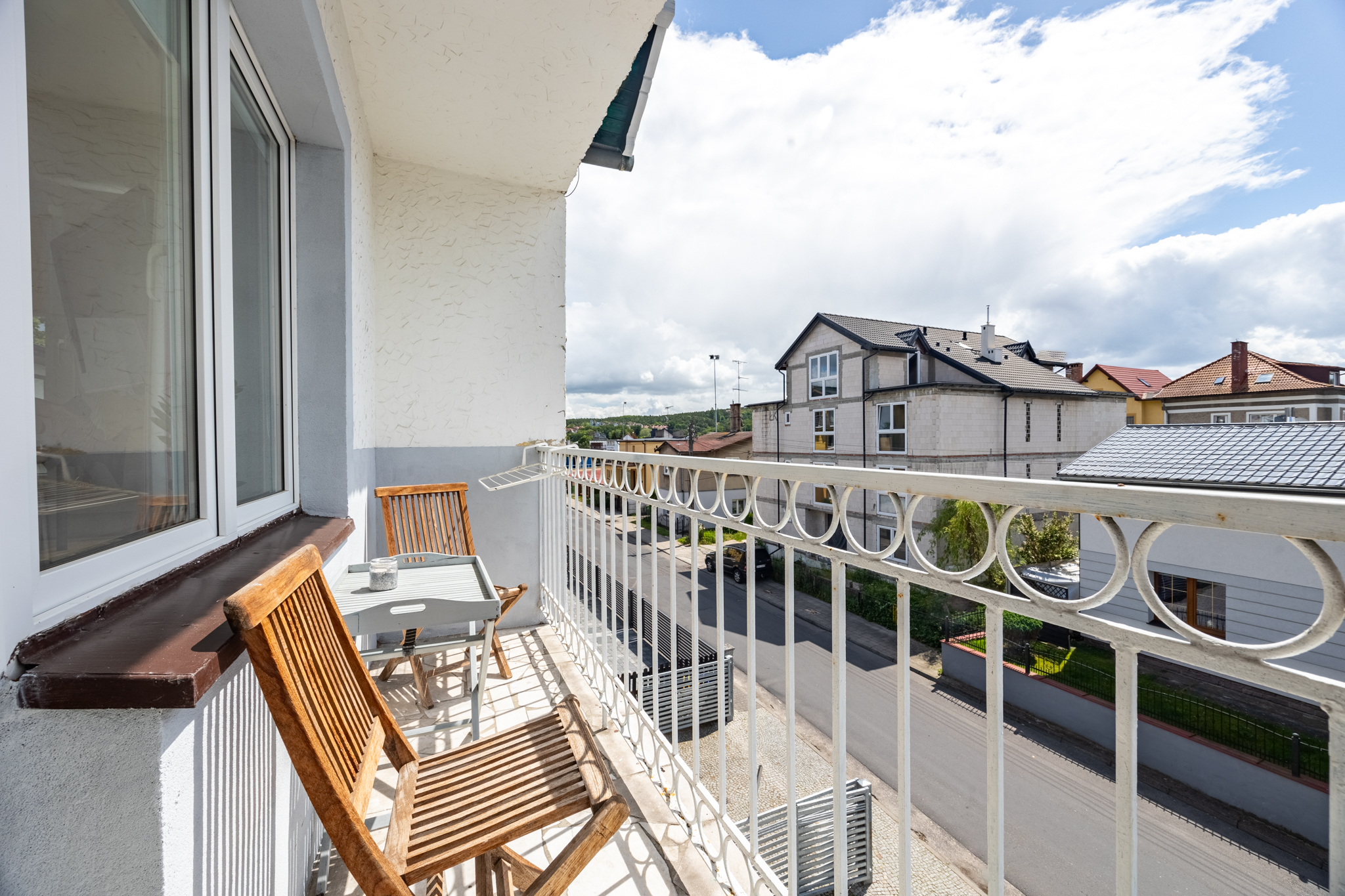 Słoneczny balkon tylko do dyspozycji tego pokoju stół dwa krzesła.